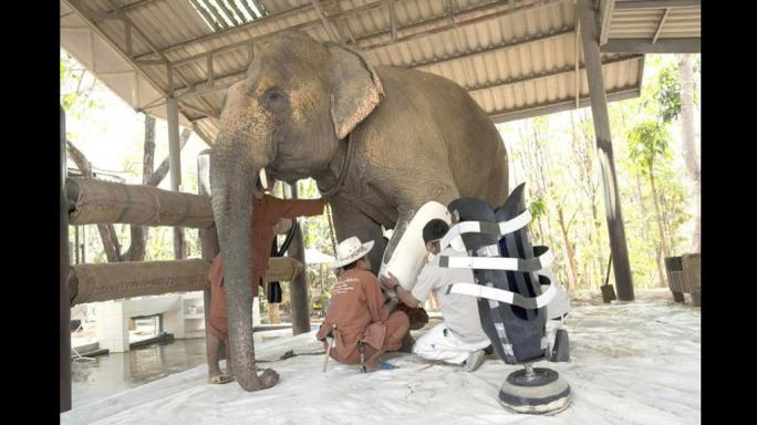 En Tailandia ayudaron a Motola, una hembra que perdió uno de sus miembros al pisar una mina, con una pata artificial y ahora soporta sus tres toneladas de peso sin dificultad.