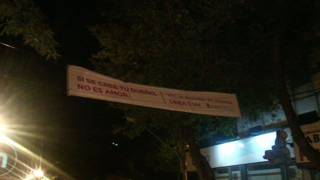 En este pasacalles se lee "si se cree tu dueño, no es amor" y se invita a utilizar la línea 144 para denunciar violencia de género.