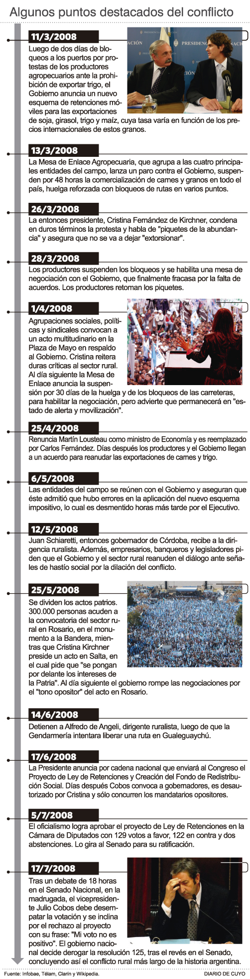 Recorriendo las crónicas de los diarios de ese año, las imágenes de las agencias de noticias y apelando a la memoria de los periodistas con más tiempo en la redacción de DIARIO DE CUYO, salta a la vista una afirmación clave: la resolución 125 fue un grave error que sacudió la estabilidad del país. Un ministro sin formación política trabajando junto a una presidenta que empezaba a acomodarse, resultaron un combo casi explosivo para el resto de los argentinos. Cacerolazos, incidentes, paros, cortes de calle, un ministro expulsado y un quiebre político en altos mandos, fueron algunas de las consecuencias de un conflicto que aún buena parte de la sociedad recuerda. Un día como hoy, hace diez años, el exjefe de la cartera económica nacional, Martín Losteau, anunciaba que se establecía un sistema móvil para las retenciones impositivas a la soja, el trigo y el maíz, lo que provocó el reclamo unánime de las entidades con mayor peso del campo argentino. Desde ahí hasta el voto “no positivo” de Julio Cobos, pasaron 129 días de furia e inestabilidad política, que provocaron divisiones hasta en el mismo armado político transversal del matrimonio presidencial. Muchos no estuvieron de acuerdo con el “blanco o negro” o el “campo o Patria” que propalaban permanentemente desde el kirchnerismo. Incluso el hoy gobernador de San Juan, Sergio Uñac, mientras fue intendente de Pocito, planteó distancia y salió a defender al campo. “Eso no estaba en el libreto original”, dijo. Habrá acto en Buenos Aires.