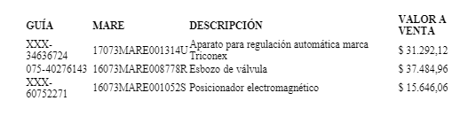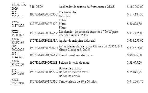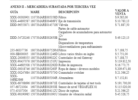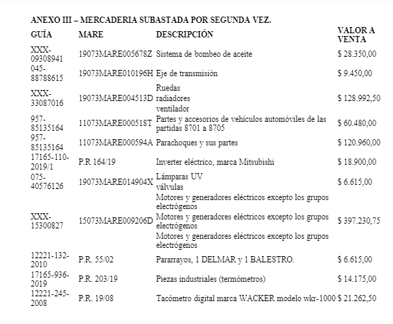 A continuación, el detalle de los productos que entran en la subasta: