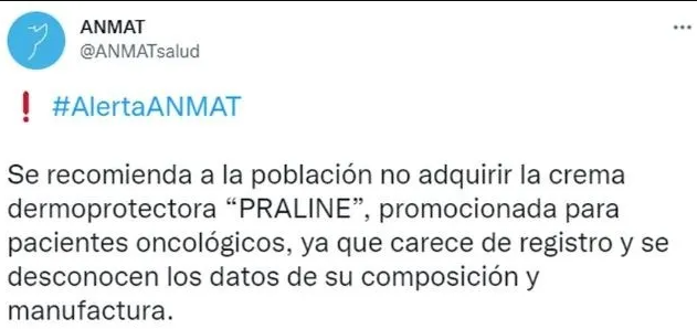 La ANMAT recomienda a la población "abstenerse de adquirir y utilizar este producto", refiriéndose a la crema destinada a pacientes oncológicos, por cuanto "se desconoce tanto su composición real como las condiciones higiénicas sanitarias bajo las cuales se efectuó su manufactura". De esta manera, expresa que esta situación, a su vez, "se ve agravada por la vulnerabilidad del público al que está dirigido".