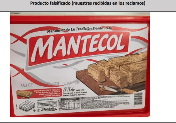 "Las presentes actuaciones se iniciaron como consecuencia de un oficio del Juzgado Federal en lo Criminal y Correccional N° 2 de San Isidro, a través del cual el Departamento Vigilancia Sanitaria y Nutricional de los Alimentos del Instituto Nacional de Alimentos (INAL) tomó conocimiento de una denuncia de la firma Mondelez Argentina SA en relación a la comercialización del producto falsificado en cuyo rótulo luce: ‘Postre a base de pasta de maní y cacao marca MANTECOL, RNE Nº 02-0000604, RNPA Nº 02-569076, presentación envase de plástico 3,3 Kg, Vencimiento 12/02/23, L18 140’, que no cumple la normativa vigente por tratarse de un producto falsificado que utiliza la información de un alimento genuino, carece de registros y se encuentra falsamente rotulado", informó ANMAT