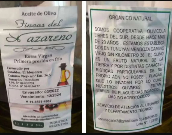 En consecuencia, se dispuso: "Prohíbese la elaboración, fraccionamiento y comercialización en todo el territorio nacional y en plataformas de venta en línea del producto: Aceite de oliva marca Fincas del Nazareno, – Extra virgen – Primera presión en frío – Envasado por Establecimiento el monarca – Camino viejo s/n° km. 36,5 – Tunuyán, Mendoza. – RPE Nº: 02-033731 – RNPA Nº: 02-0356777 en cualquier presentación, lote y fecha de vencimiento, por carecer de registros sanitarios, resultando ser un producto ilegal".