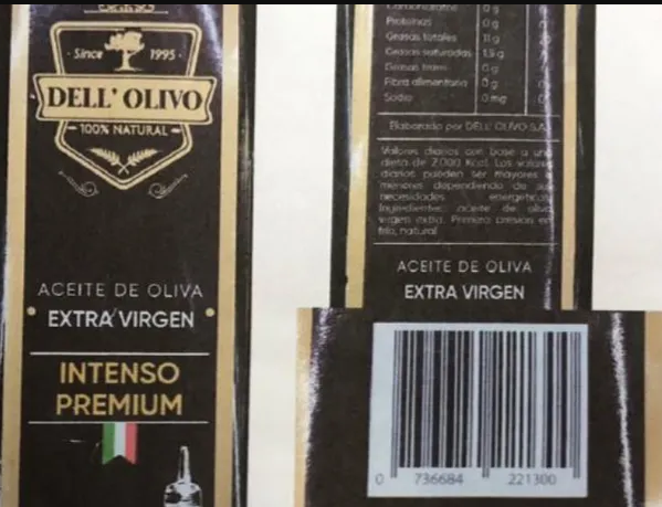 "Prohíbese la elaboración, fraccionamiento y comercialización en todo el territorio nacional y en plataformas de venta en línea del producto: Aceite de oliva extra virgen – Intenso Premium – marca Dell’ Olivo – Elaborado por Dell’ Olivo S.A – RNE N° 04055381, RNPA N° 04066198, en cualquier presentación, lote y fecha de vencimiento, por carecer de registros sanitarios y estar falsamente rotulado al indicar un RNE inexistente y un RNPA correspondiente a otro producto, resultando ser un producto ilegal", informó ANMAT.