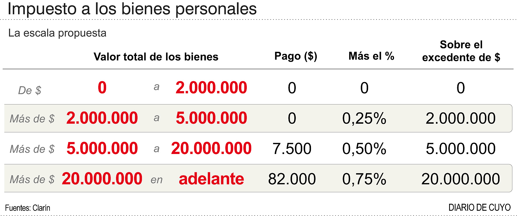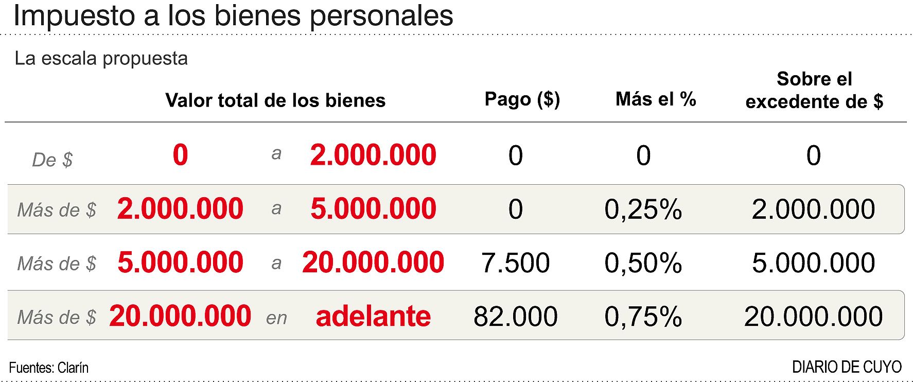Al mismo tiempo, eleva las alícuotas para aquellos de mayor poder adquisitivo. Quienes declaren bienes entre $2.000.000 y $5.000.000 pagarán una tasa de 0,25%; de $5.000.000 a $10.000.000 tributarán 0,50%, y a partir de los $20.000.000, la tasa será de 0,75 por ciento -ver gráfico-.