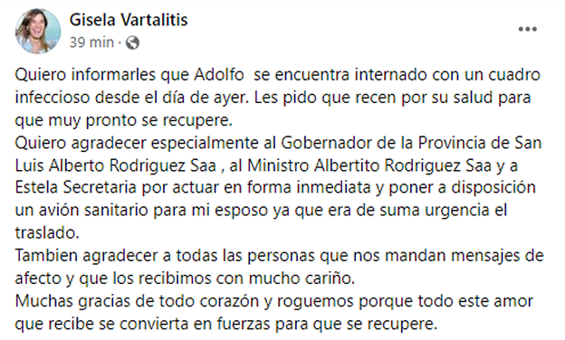 Quiero informarles que Adolfo se encuentra internado con un cuadro infeccioso desde el día de ayer. Les pido que recen por su salud para que muy pronto se recupere. Quiero agradecer especialmente al Gobernador de la Provincia de San Luis Alberto Rodriguez Saa , al Ministro Albertito Rodriguez Saa y a Estela Secretaria por actuar en forma inmediata y poner a disposición un avión sanitario para mi esposo ya que era de suma urgencia el traslado. Tambien agradecer a todas las personas que nos mandan mensajes de afecto y que los recibimos con mucho cariño. Muchas gracias de todo corazón y roguemos porque todo este amor que recibe se convierta en fuerzas para que se recupere.