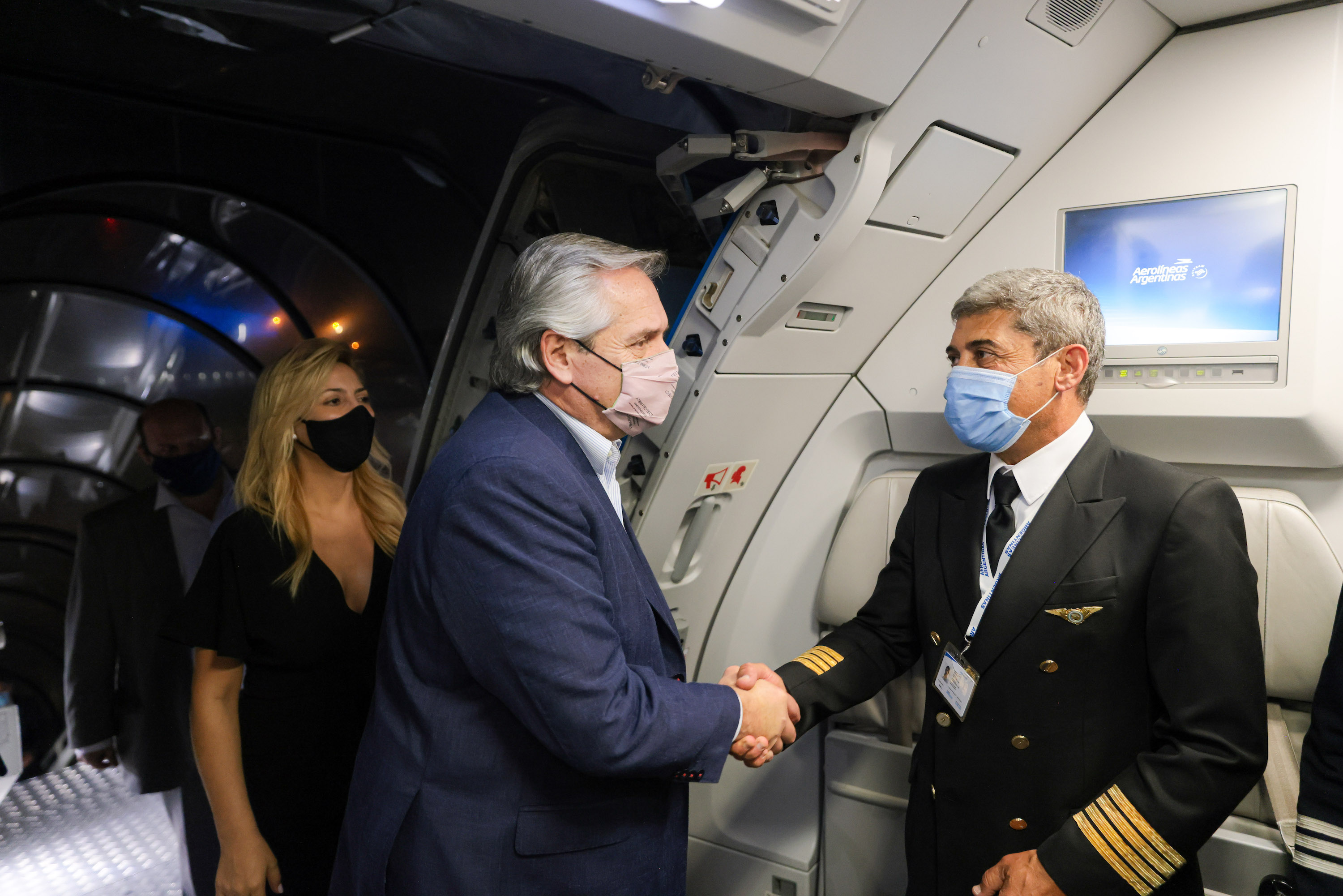 La comitiva presidencial está integrada por la primera dama Fabiola Yañez; los ministros de Relaciones Exteriores, Comercio Internacional y Culto, Santiago Cafiero; de Medio Ambiente, Juan Cabandié; de Agricultura, Julián Domínguez, y el embajador argentino ante los Estados Unidos y sherpa en el G20 Jorge Argüello; según informaron fuentes oficiales.