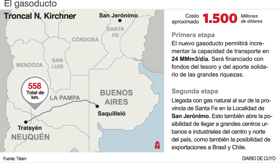 El secretario de Energía, Dario Martínez, precisó en el acto que en las primeras semanas de mayo se lanzará la licitación de la obra, con vistas a adjudicarla en julio y que comiencen los trabajos en agosto. La primera etapa del proyecto incluye la construcción de un ducto de 558 km entre Tratayén (Neuquén) y Salliqueló (provincia de Buenos Aires), la construcción de otros tramos y la ampliación de gasoductos ya existentes, con una inversión de 1.500 millones de dólares.