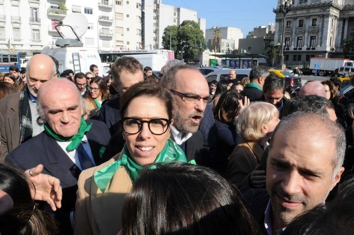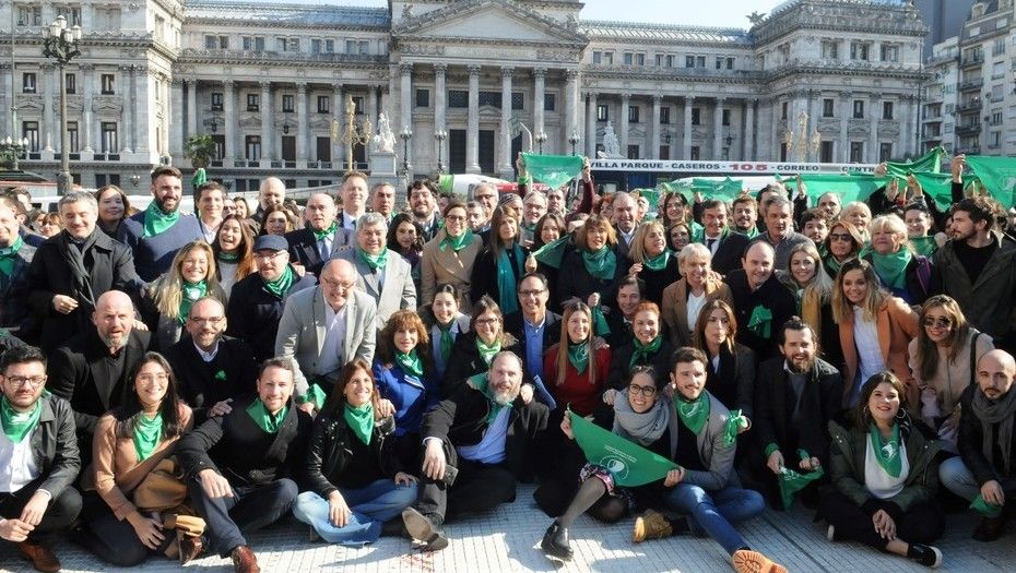Son días claves en la discusión del aborto: la semana que viene la Cámara de Diputados votará si aprueba o no la Interrupción Voluntaria del Embarazo. Los legisladores negocian consensuar un proyecto porque los votos están muy peleados. Los partidos políticos están divididos en su interior sobre este tema, salvo la izquierda, que vota a favor de la legalización. Para desenmarcarse del “no”, un grupo de funcionarios y legisladores de Cambiemos –que tiene mayoría en contra- se plantó ante el Congreso para sacarse una foto con sus pañuelos verdes a favor de la ley.