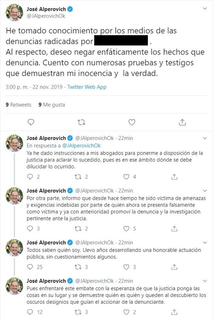 Alperovich no sólo negó las acusaciones sino que contraatacó afirmando que fue “víctima de amenazas y exigencias por parte de quién ahora se presenta falsamente como víctima” y aseguró que con anterioridad promovió “la denuncia y la investigación pertinente ante la justicia”.