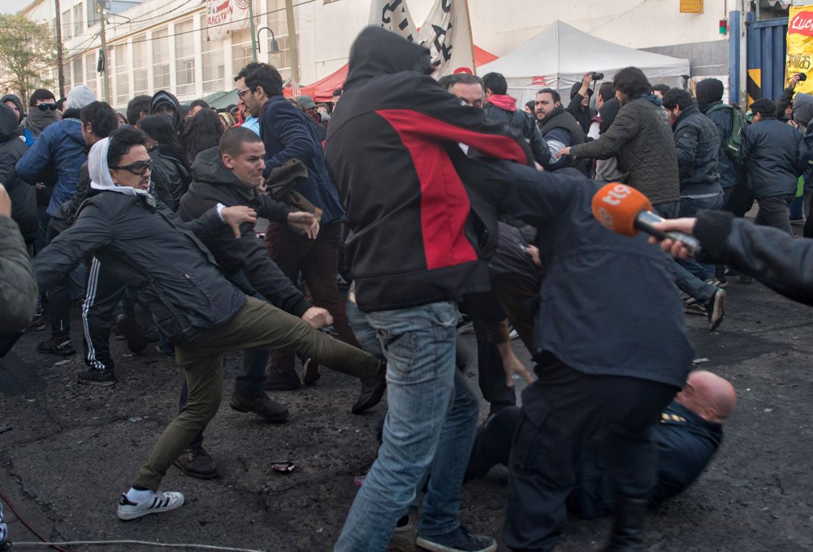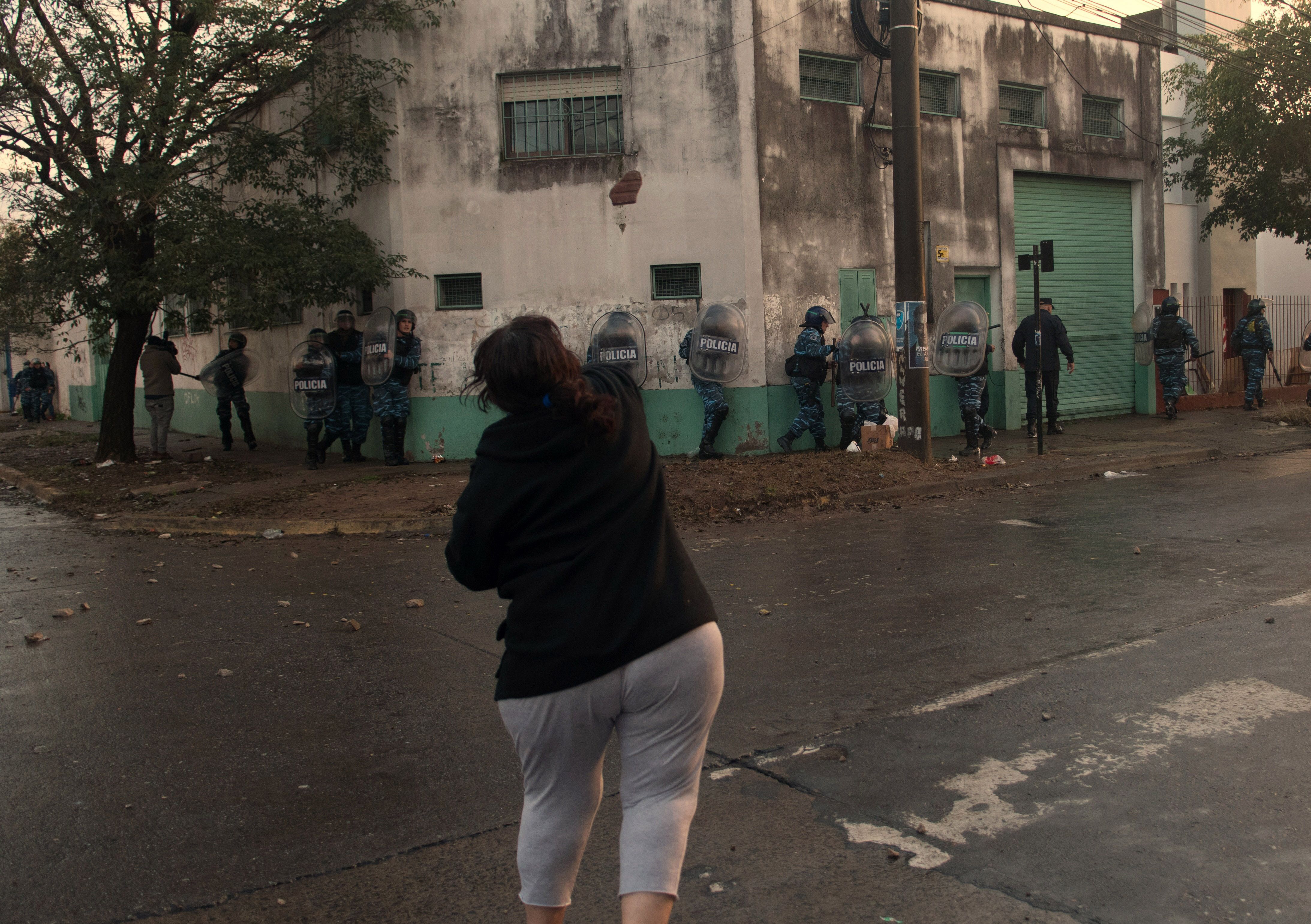 El avance de las fuerzas de seguridad produjo la reacción de los ocupantes que desde la azotea comenzaron a arrojar ladrillos y objetos contra los uniformados, mientras que en las inmediaciones se concentraban militantes sindicales y políticos que, en solidaridad con los trabajadores de Pepsico, buscaban evitar el desalojo.