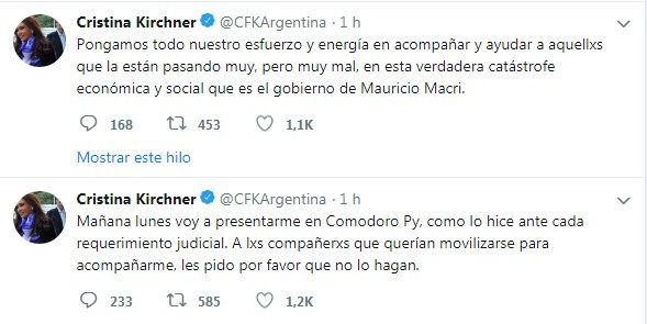 Un día antes de tener que presentarse en Comdoro Py en el marco de la causa de investigación por coimas que se inició tras la aparición de los cuadernos, la expresidenta Cristina Fernández se refirió al tema. Lo hizo a través de dos tuits en los que realizó un pedido a la militancia y apuntó contra Macri por la “catástrofe económica y social”.