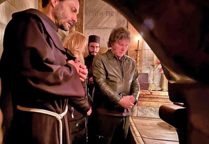 En una de las fotos Milei, siempre vestido con su campera de cuero negro, y su hermana, aparecen arrodillados y prendiendo unas velas en la piedra del Santo Sepulcro, un lugar sagrado. En otra, se los ve en la entrada del templo junto a dos frailes franciscanos, capuchinos, custodios de esta Iglesia que es propiedad de diversas congregaciones cristianas. De enormes piedras blancas típicas de Jerusalén, el templo, que en su entrada alberga la lápida de mármol en la que fue apoyado el cuerpo de Jesús después de su crucifixión -otro lugar venerado, que suele ser besado-, normalmente es meta de millones de peregrinos de todo el mundo. Pero desde el 7-10, tras el ataque de Hamas y la guerra, todo cambió y ya no hay filas interminables para ingresar allí, donde todo luce vacío y silencioso.