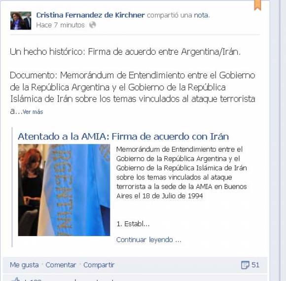 Cristina Kirchner publicó en las redes sociales el documento que fue rubricado por el canciller Héctor Timerman y por el Ministro de Relaciones Exteriores de la nación islámica, Ali Akbar Salehi. El mismo puede consultarse al final de la nota.