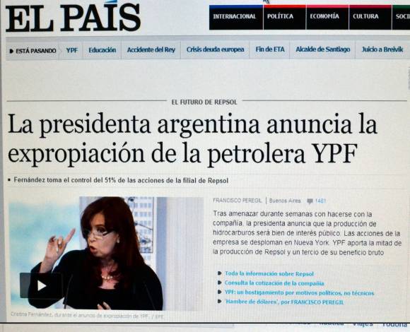 Entre los principales diarios españoles, El Mundo titulaba ayer ‘Kirchner expropia YPF’ y de la misma forma el diario el País de España que decía en el momento del anuncio de Cristina Fernández ‘La presidenta argentina anuncia la expropiación de la petrolera YPF’.