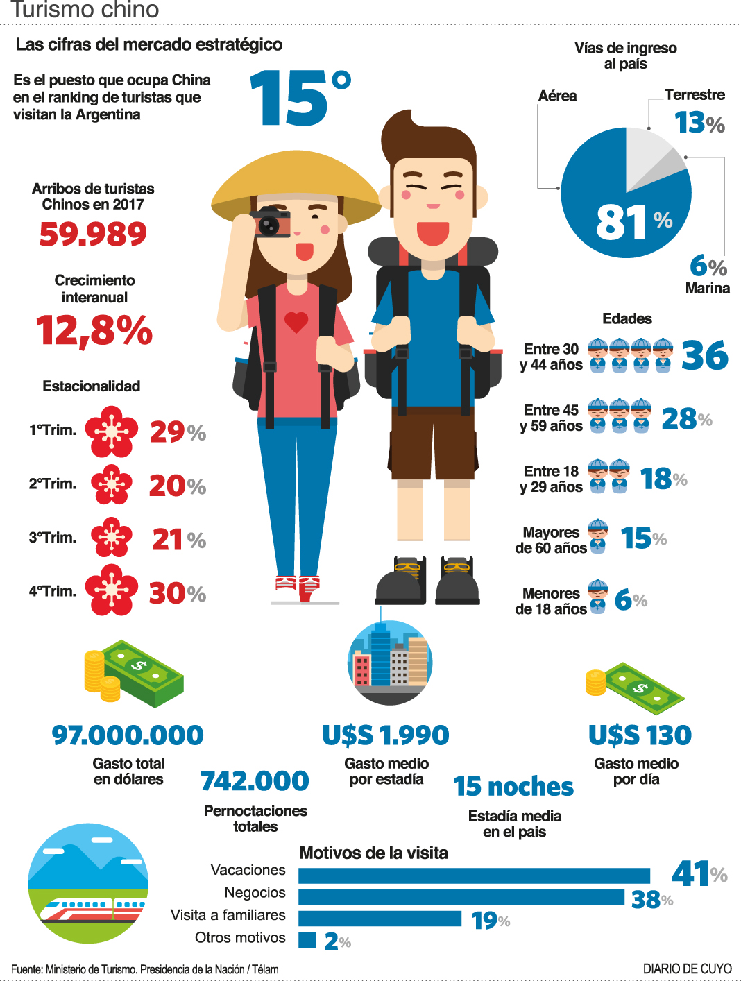En la actualidad, China ocupa el puesto 15 en el ranking de llegada de turistas extranjeros a la Argentina, con casi 60.000 arribos en 2017, de los cuales 81 por ciento lo hizo por vía aérea; el 13 por ciento por vía terrestre; y el 6 por ciento por vía fluvial marítima. El gasto promedio por estadía del turista chino en el país fue de 1990 dólares, con un gasto diario de 130 dólares, y la estadía promedio fue de 15 noches, con un 50 por ciento que eligió los hoteles 4 y 5 estrellas para su alojamiento. El turismo emisivo de China es el líder mundial, con 120 millones de turistas, y se proyecta que para 2025 serán 220 millones. A su vez, son los que más gastan, con un promedio que supera los 260.000 millones de dólares por año. Télam