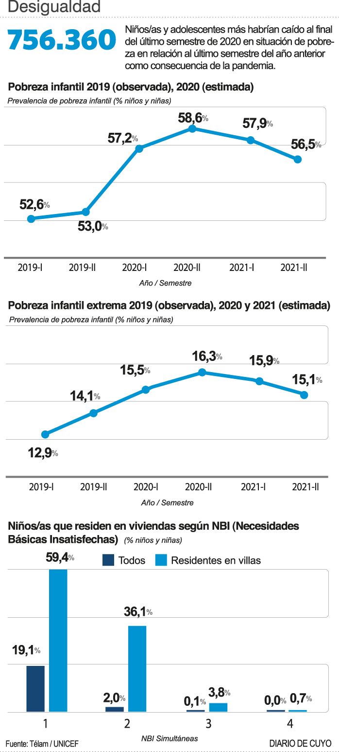 Por otro lado, el análisis muestra fuertes desigualdades, dado que la incidencia de la pobreza aumenta significativamente cuando las niñas, niños y adolescentes residen en hogares donde la persona adulta de referencia está desocupada (94,4%), con un trabajo informal (83,9%), con bajo clima educativo (92,9%), migrantes internacionales (70,8%) o con jefatura femenina (67,5%). Además, si la vivienda está localizada en una villa o en barrios populares, la incidencia de la pobreza en 2020 alcanzará a nueve de cada 10 niñas y niños, de acuerdo al informe.