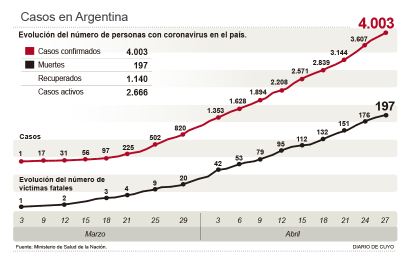 El Ministerio de Salud registró ayer 5 nuevas muertes por coronavirus y 111 contagios en las últimas 24 horas en Argentina. Así, la cifra del total de infectados en todo el país ascendió 4.003 y las víctimas fatales suman 197. Argentina superó el umbral de los 4.000 casos de contagio en el primer día de la nueva etapa del aislamiento. Los cinco fallecidos son dos mujeres, una de 81 años, residente en la provincia de Buenos Aires; y otra de 70 años, residente en la provincia de Córdoba; y tres hombres, dos de 81 y 68 años, ambos residentes en la Ciudad de Buenos Aires (CABA); y otro de 90 años, residente en la provincia de Chaco.