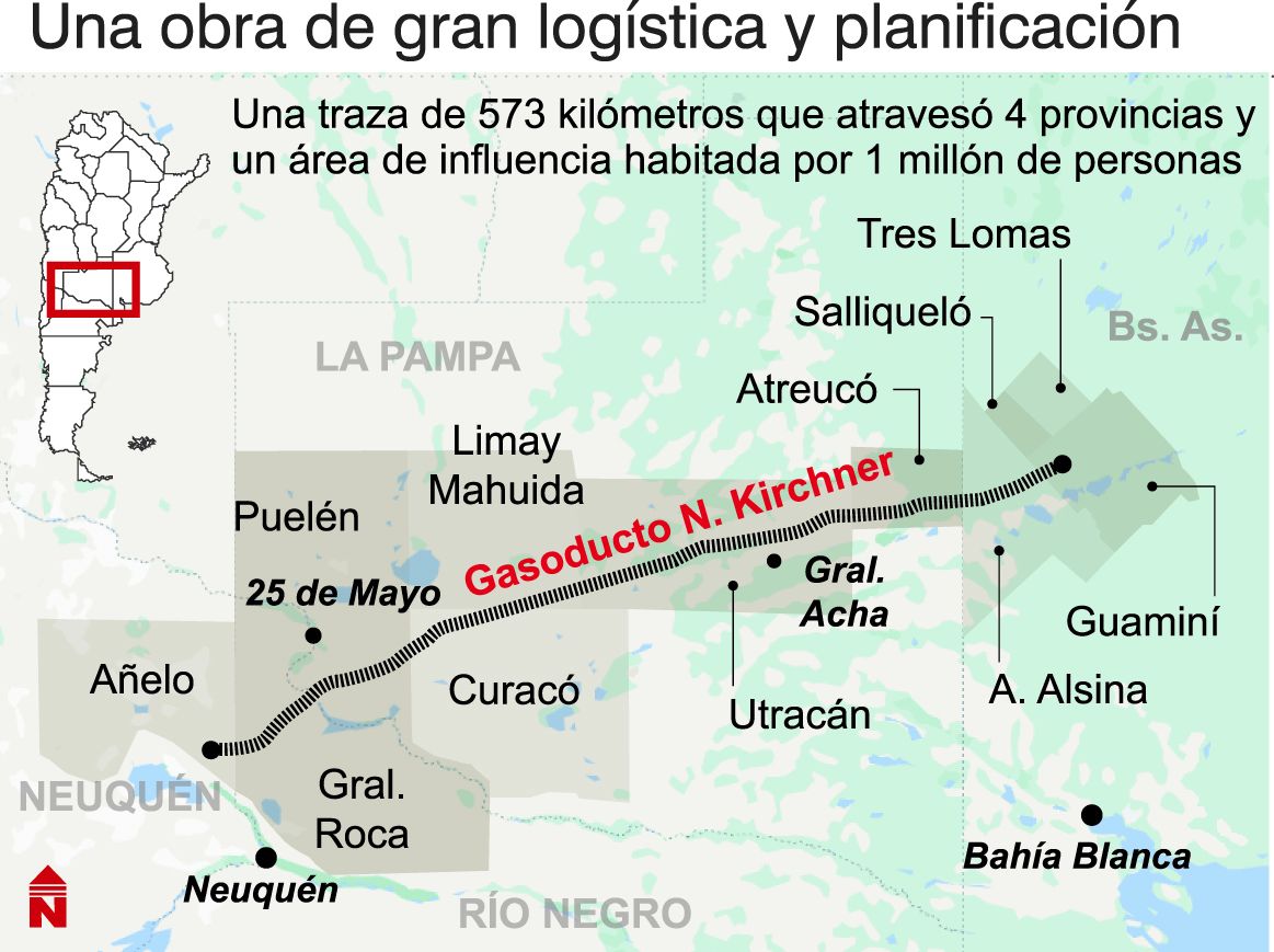 Lo que comenzará a funcionar hoy es el primer tramo de la obra, 573 km que une la localidad de Tratayén, de Neuquén (centro sur), donde se ubica Vaca Muerta, con Salliqueló, de la provincia de Buenos Aires (centro). Desde allí se abastece de gas al centro del país. La traza también pasa por Río Negro y La Pampa. Se utilizaron aproximadamente 300.000 toneladas de cañerías, lo que equivale a 4.285 obeliscos porteños, en el tendido de la primera etapa.
