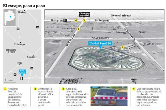 La versión de la fuga más ajustada dice que a eso de las 2.30 de ayer, Schillaci y los hermanos Lanatta salieron de la cárcel de General Alvear a bordo de un viejo Fiat 128 perteneciente a un guardiacárcel a quien habían tomado de rehén. Pocas cuadras después bajaron al prisionero, y cuando llegaron al barrio Belgrano abandonaron el Fiat y se subieron a una camioneta negra que los esperaba con otro cómplice. Todos se perdieron en la noche.