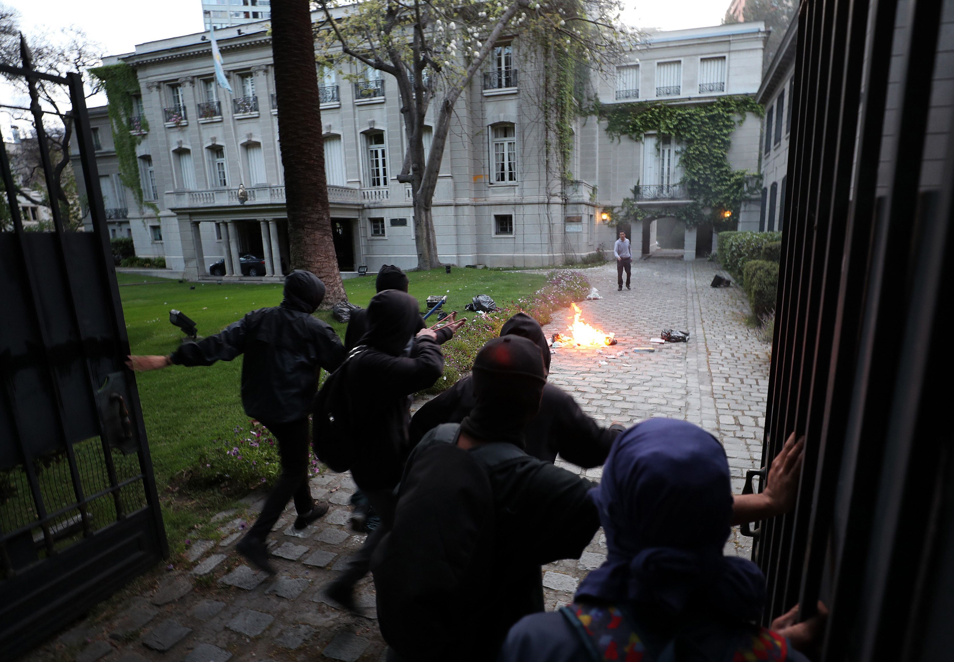 El embajador en Chile, José Octavio Bordón, confirmó que los atacantes rompieron la reja de ingreso a un patio trasero del edificio, destruyeron un automóvil y rompieron vidrios, y dijo que "algunos de ellos portaban hondas".