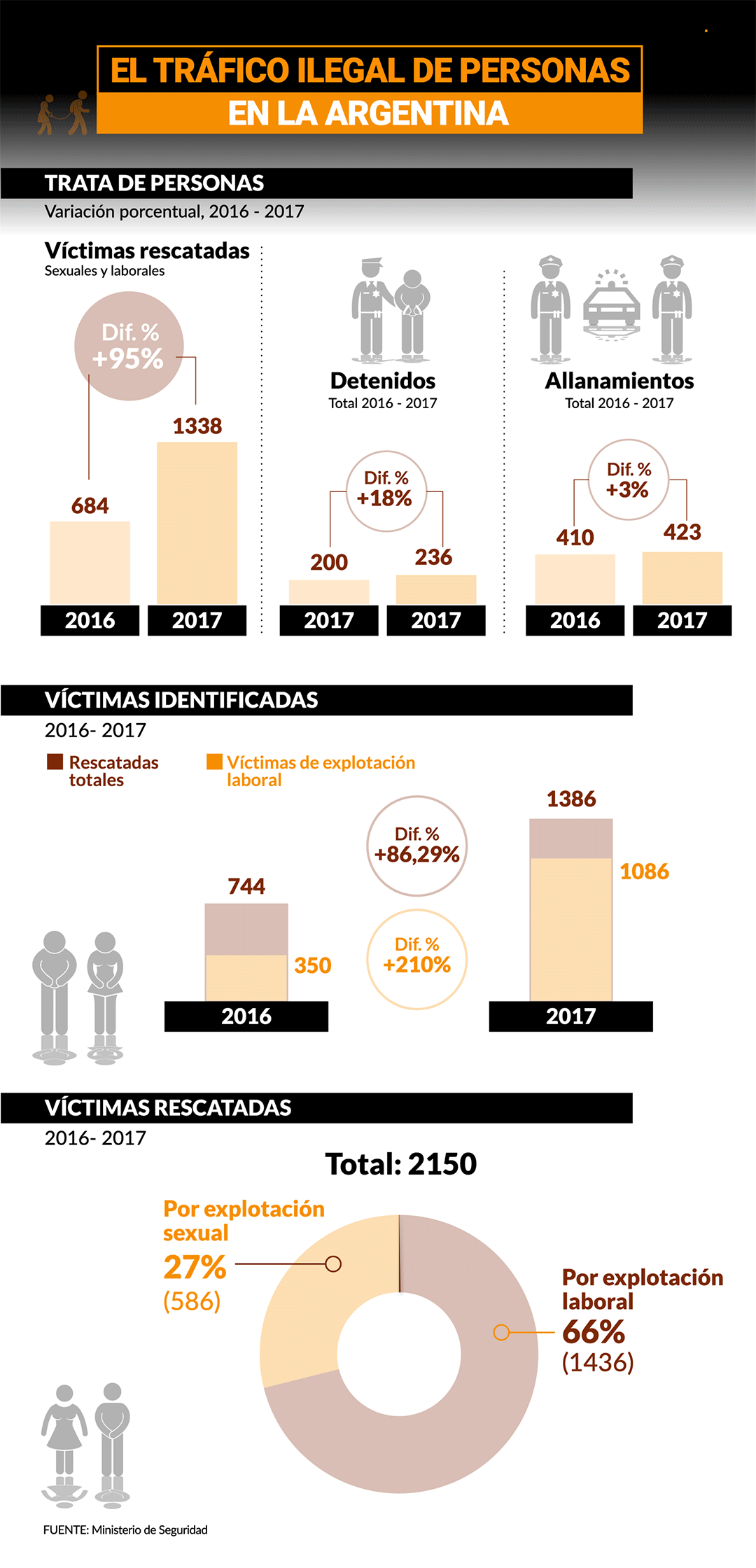 Detrás de cada cifra hay historias de vida y sufrimiento. Entre 2016 y 2017 la cantidad de víctimas rescatadas de explotación laboral creció en un 201% mientras que los casos de explotación sexual aumentó en un 27%.