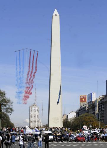 Miles de personas se congregaron sobre la avenida 9 de Julio y alrededores, (incluyendo la zona del Obelisco) así como desde los edificios cercanos, donde los aviones pintaron en el cielo las banderas de Francia y Argentina.