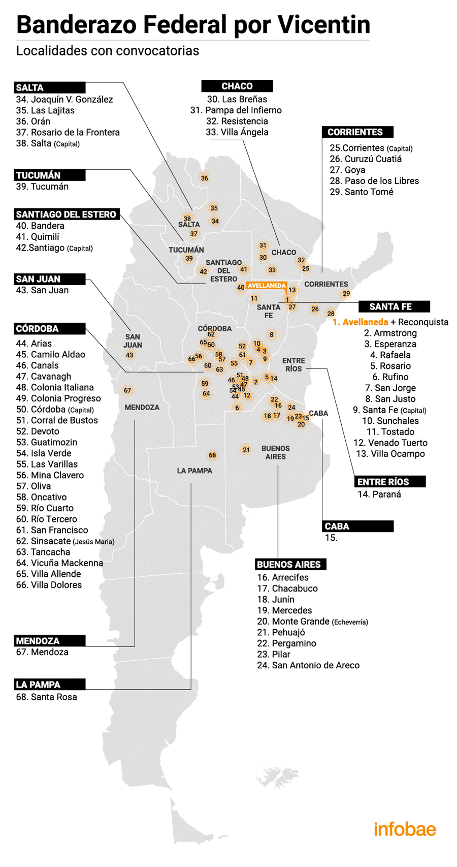 Además de Avellaneda, se suman a la movilización casi 70 distritos del país, ubicados en las provincias de Santa Fe, Buenos Aires, Córdoba, Chaco, Corrientes, Entre Ríos, Santiago del Estero, Tucumán, Salta, Mendoza y La Pampa, entre otras. Capital Federal tendrá su movilización en el Obelisco porteño.