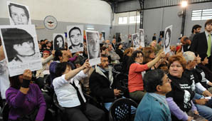 Buenos Aires, 2 de noviembre.- Centenares de familiares levantaron las fotos de las víctimas apenas los imputados ingresaron en fila a la sala de audiencias, donde se destacaba la presencia del ministro de Justicia, Julio Alak, y miembros de organismos de derechos humanos, entre ellos Taty Almeida, Angela Boitano e HIJOS.