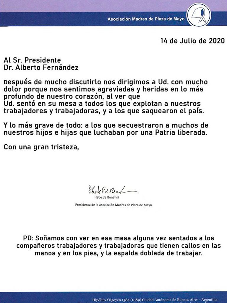 “Después de mucho discutirlo nos dirigimos a Ud. con mucho dolor porque nos sentimos agraviadas y heridas en lo más profundo de nuestro corazón, al ver que Ud. sentó en su mesa a todos los que explotan a nuestros trabajadores y trabajadoras, y a los que saquearon el país. Lo más grave de todo: a los que secuestraron a muchos de nuestros hijos e hijas que luchaban por una Patria liberada”, firma Bonafini con “gran tristeza” en un breve escrito fechado este martes 14 de julio.