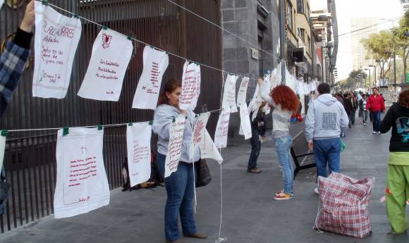 Los activistas, se reúnen cada fin de semana en una plaza céntrica de esa ciudad para bordar denuncias sobre desaparecidos sobre pañuelos blancos. La idea es que cada uno de ellos cuente en punto de cadena la historia de alguno de los 136.000 mexicanos asesinados en los últimos 6 años como consecuencia de la guerra contra el narcotráfico en ese país.