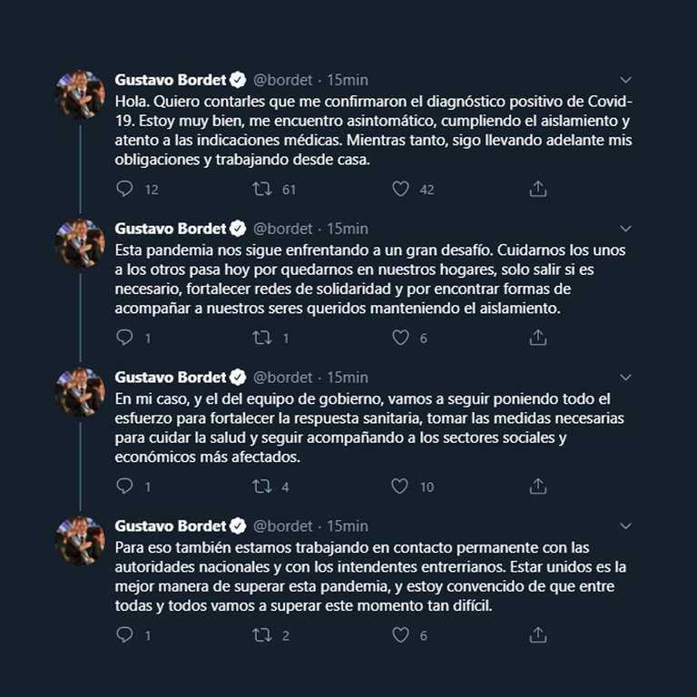 El Gobernador de la provincia de Entre Ríos, Gustavo Bordet, contó que tiene coronavirus. Lo hizo esta tarde a través de sus redes sociales. “Quiero contarles que me confirmaron el diagnóstico positivo de COVID-19. Estoy muy bien, me encuentro asintomático, cumpliendo el aislamiento y atento a las indicaciones médicas. Mientras tanto, sigo llevando adelante mis obligaciones y trabajando desde casa”, explicó vía Twitter.