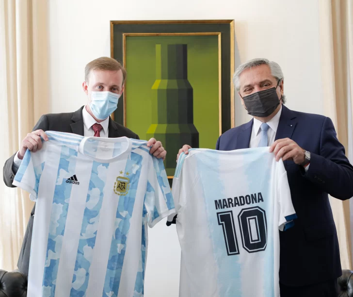 La reunión en Olivos transcurrió en un buen clima que se coronó con una foto de Fernández y Sullivan sosteniendo camisetas de la Selección nacional, una de ellas con la inscripción de Maradona y el número 10. Por otro lado, Biden nominó ayer a Marc Stanley para que se convierta en embajador en Argentina. Se trata de un abogado, activista político, líder de la comunidad judía y filántropo de Dallas, Texas.
