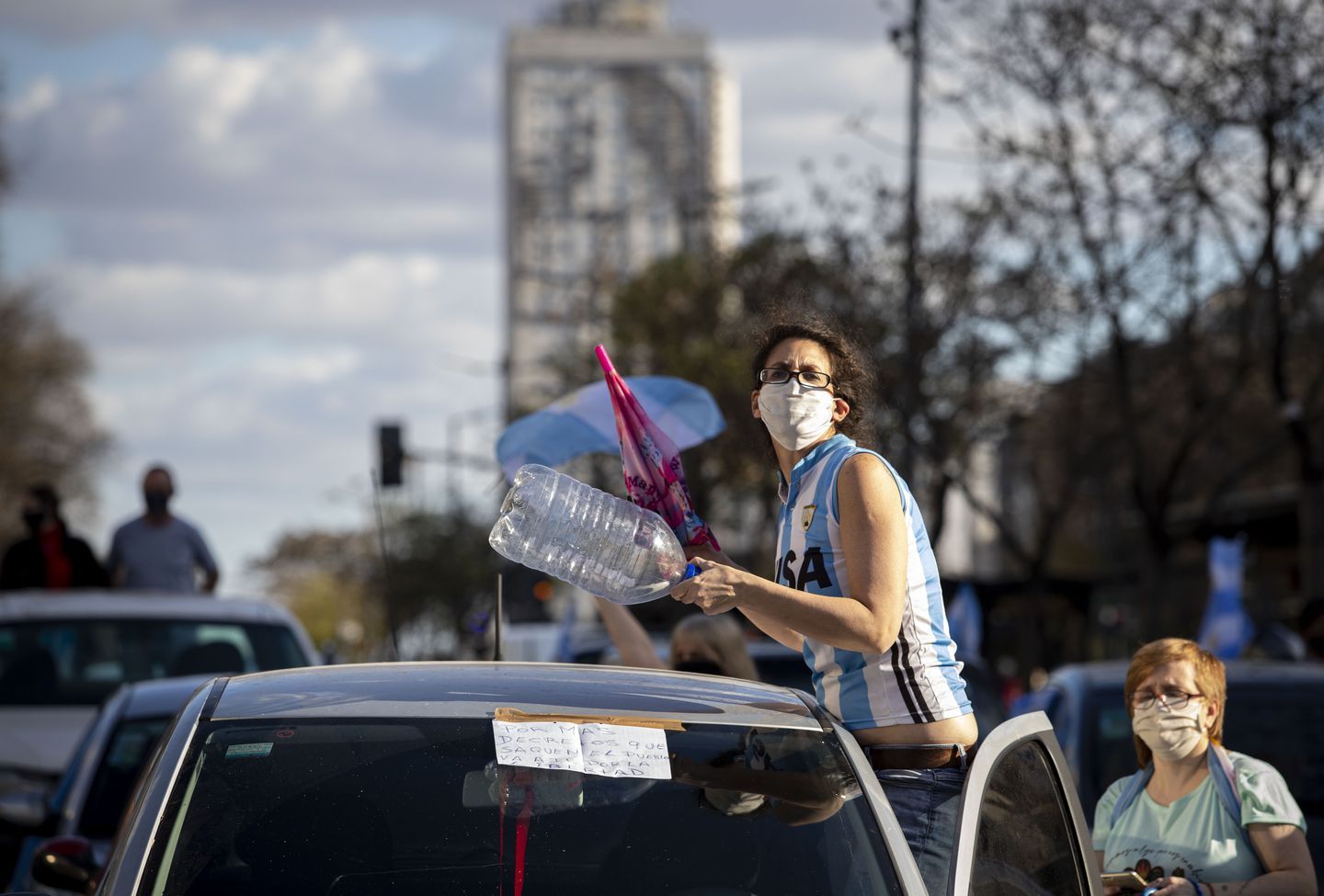 La inmediata apertura de la cuarentena para reactivar a los sectores económicos más golpeados también fue una de las principales consignas esgrimidas por la multitud que reclamó en torno al Obelisco. A su vez, hubo enojo con el Gobierno por las tomas de tierras y el avance sobre la propiedad privada.