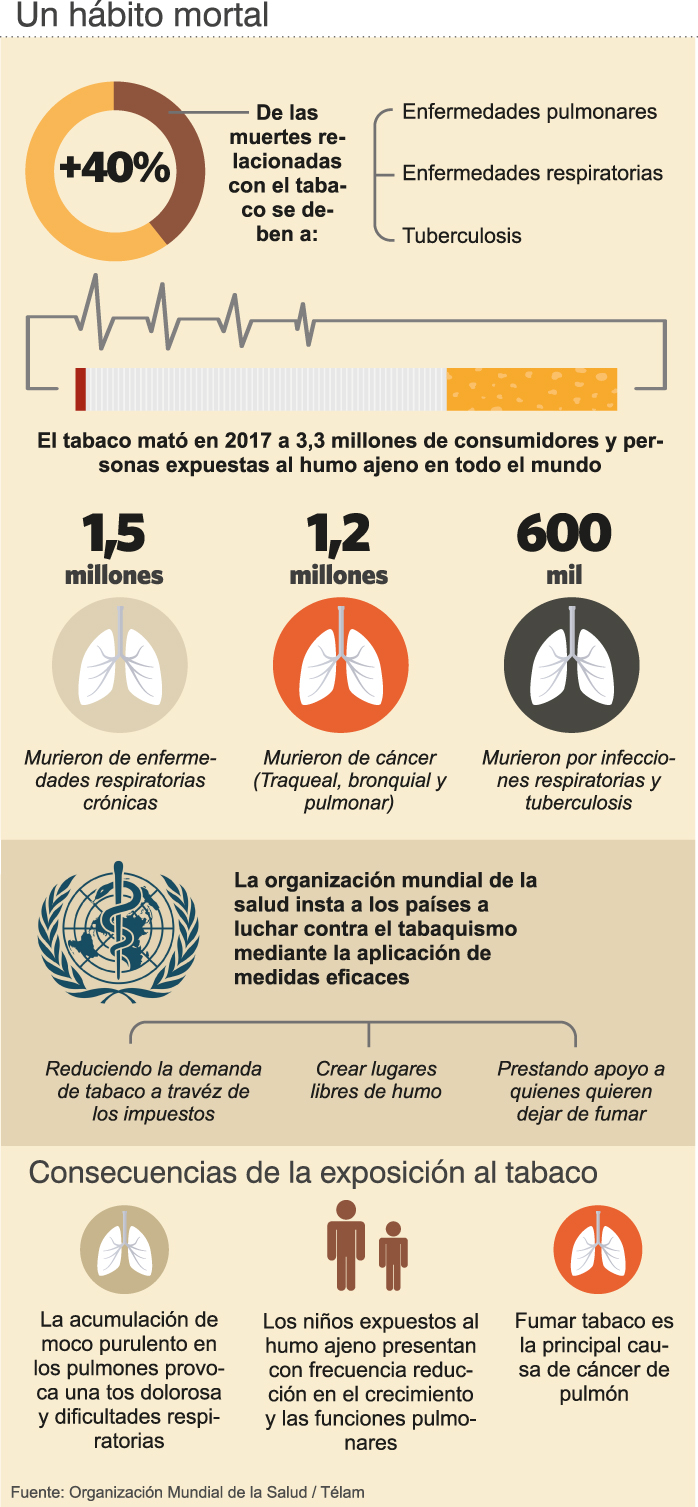 En Argentina cada año mueren 44.000 personas por causas vinculadas al consumo de tabaco, según datos de la cuarta Encuesta Nacional de Factores de Riesgo (ENFR), que alertó además que el 22,2 por ciento de la población adulta fuma, una de las tasas más altas de la región de las Américas.