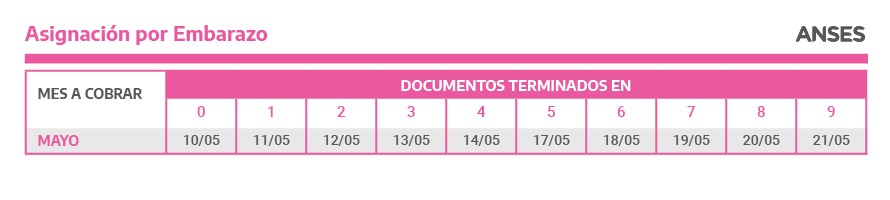Asimismo, la Asignación por Embarazo se empezará a pagar el lunes 10 de mayo para los documentos que finalicen en 0 hasta el viernes 21 de mayo para los que terminen en 9.