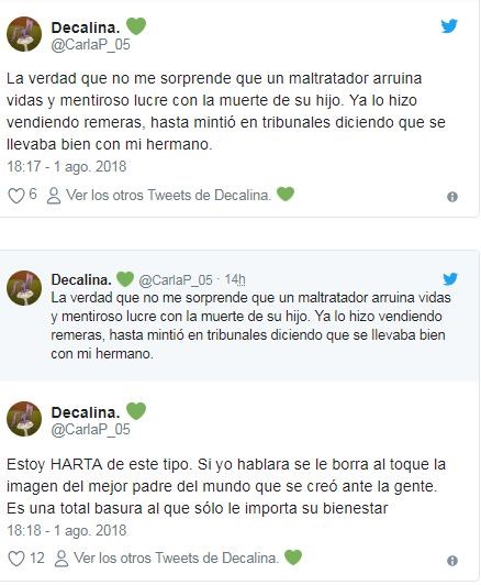 Indignada por la situación, la joven ahondó en detalles sobre la relación que su papá mantenía con Fernando antes de su muerte: “La verdad que no me sorprende que un maltratador arruina vidas y mentiroso lucre con la muerte de su hijo. Ya lo hizo vendiendo remeras, hasta mintió en Tribunales diciendo que se llevaba bien con mi hermano”.