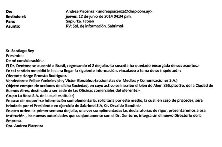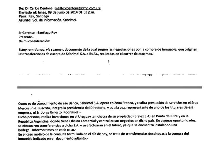 El hallazgo llegó de la mano del responsable visible de Sabrimol Trading, el contador uruguayo Carlos Dentone. El 9 de junio de 2014 debió explicarle al Banco Itaú en Uruguay que él presidía esa sociedad, pero que en realidad era el "representante de uno de los titulares de esa empresa, el Sr. Jorge Ernesto Rodríguez".