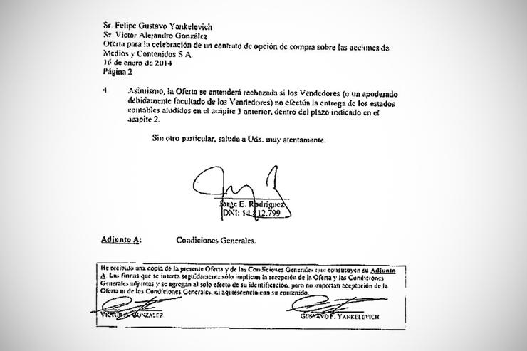 ¿Cómo les demostró Dentone al Itaú de que, en efecto, trabajaba para Rodríguez y que ese dinero fue a la compra del piso 33 del edificio que queda en la esquina porteña de las avenidas Leandro N. Alem y Córdoba? Les entregó copias de la "Oferta de Contrato de Opción de Compra" que Rodríguez les entregó con su firma a los vendedores Felipe Gustavo Yankelevich y Víctor A. González, el 16 de enero de 2014, y la respuesta de estos, del 10 de marzo.