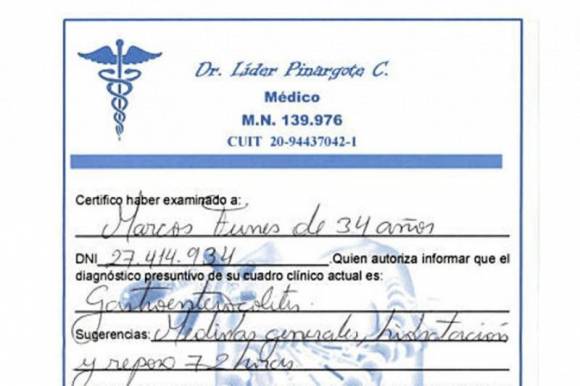 Al cabo de 24 horas, se consiguió un certificado donde se deja constancia que ‘el paciente ha sido atendido en la fecha, presentando un cuadro de lumbalgia. Se indicó tratamiento y reposo por 7 días‘. El certificado lleva el membrete de Climédica, con dirección en la calle Saavedra 1039, de Capital, con fecha del 23 de setiembre, y firmado por el traumatólogo Fernando Dabbah. Luego, se intentó por segunda vez, y se contactó directamente a un vendedor que se presenta en Mercado Libre como Líder Pinargote, para pedirle un certificado por 72 horas. Pinargote contestó ‘no hay problema‘, y se consiguió en 3 horas, y con un diagnóstico de ‘gastrointercolitis‘. Fuente: Télam.