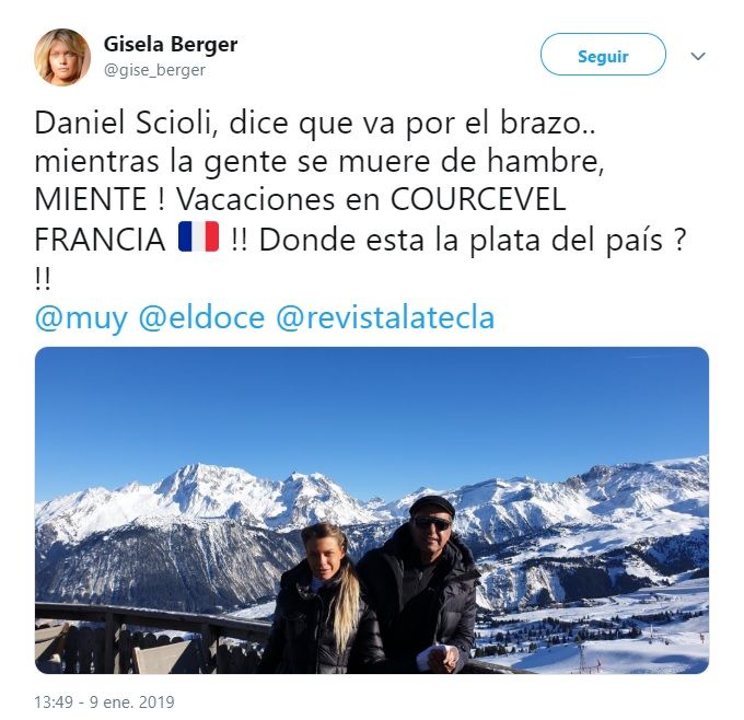 "Vacaciones en Courcevel, Francia!! ¿Dónde está la plata del país?", acotó la modelo en su posteo al que acompañó con una fotografía suya junto a Scioli on los alpes nevados como fondo.
