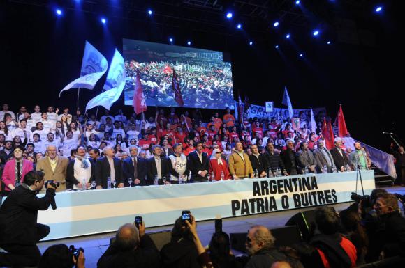 ‘En esta pelea contra los fondos especulativos está algo más que ganarle una elección a un sector, acá estamos defendiendo un proyecto político, democrático y popular, que es el que encabeza la presidenta (Cristina Fernández de Kirchner)‘, señaló Mariotto ante la militancia que llenó el estadio de Corrientes y Bouchard.