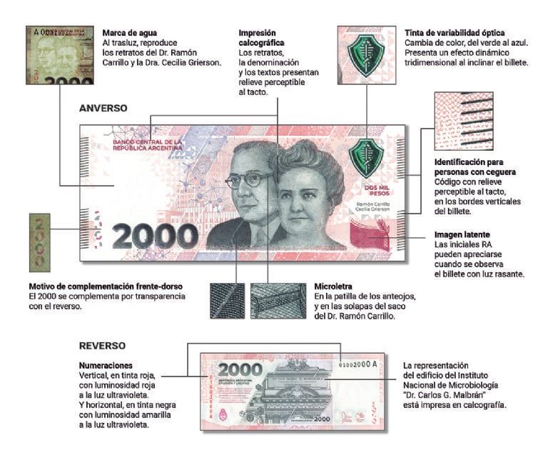 El Banco Central de la República Argentina (BCRA) puso hoy en circulación el nuevo billete de $2.000, con la distribución del mismo por la red de sucursales bancarias y cajeros automáticos, con el objetivo de que progresivamente llegue a todo el país y se incorpore a la familia de billetes de pesos de curso legal. El mismo tiene la imagen del Instituto Malbrán, de la Dra. Cecilia Grierson y el Dr. Ramón Carrillo, precursores en el desarrollo de la medicina en el país.