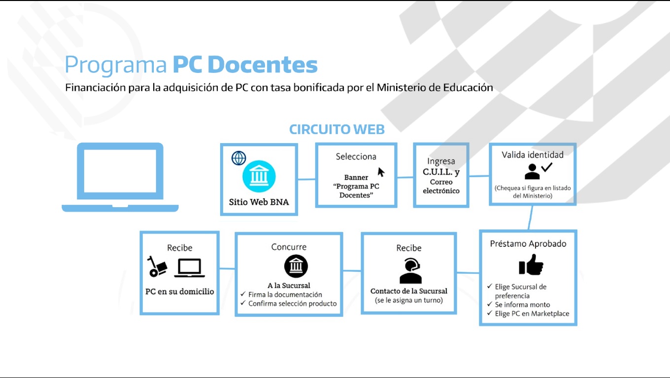 El Gobierno nacional anunció el lanzamiento de un plan para que docentes puedan comprar computadoras a una tasa del 12 por ciento, subsidiada por el Banco de la Nación Argentina, y a pagar en 36 cuotas. Según informó el presidente de la principal entidad bancaria pública, Eduardo Hecker, “en una primera etapa unos 25 mil docentes” podrán acceder a la compra de las computadoras.