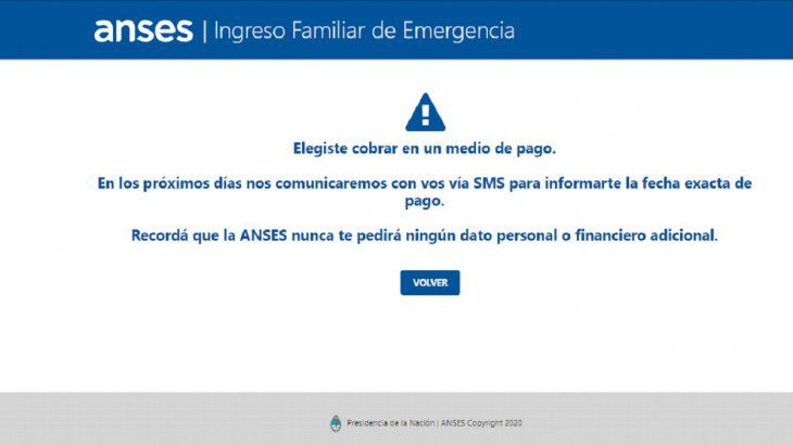 Para quienes ya habían elegido como opción de pago el depósito en su Clave Bancaria Uniforme (CBU) y para aquellos que deberán elegir esta única modalidad de cobro deberán ingresar al aplicativo “Ingreso Familiar de Emergencia – Consulta de pago” que se encuentra en la página de inicio de la Web de ANSES. Asimismo, los días de cobro también serán comunicados a cada beneficiario vía SMS. ANSES recuerda que no se solicitará ningún dato personal por esta o ninguna otra vía que no sea ingresando a la web del organismo con la clave de seguridad social.