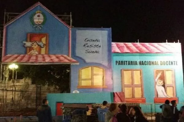 La "escuela itinerante" que los docentes instalaron frente al Congreso tiene cuatro mensajes en su frente: "Ley de financiamiento educativo", "Escuela pública Argentina", "Enseña, Resiste, Sueña" y "Paritaria Nacional docente".