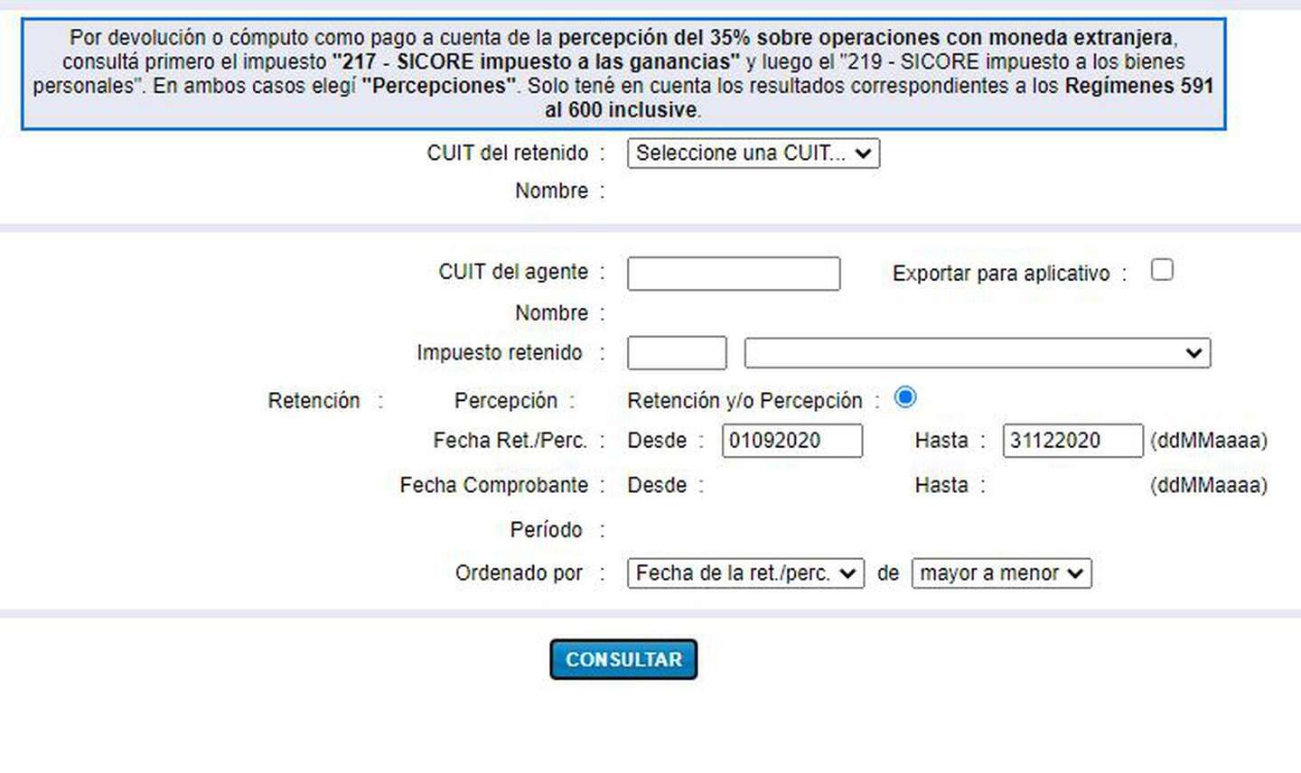Completar datos personales (CUIT y nombre y apellido) y optar por qué tipo de retención desea consultar. Para ver las percepciones sobre el dólar o gastos con tarjeta, deberá acceder al impuesto “217 Sicore impuesto a las ganancias” y seleccionar las fechas de consultar, que deben ser las de 2020.