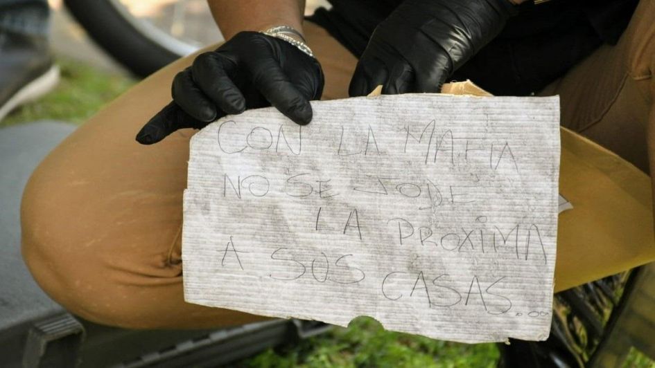 "Con la mafia no se jode, la próxima a sus casas". Un ataque mafioso presuntamente cometido durante la madrugada de este miércoles al poder político de Rosario. El cartel, dejado en la vereda del edificio del Concejo Municipal, no fue el único mensaje; además, la Policía local descubrió 12 orificios de bala en la puerta principal de la institución.