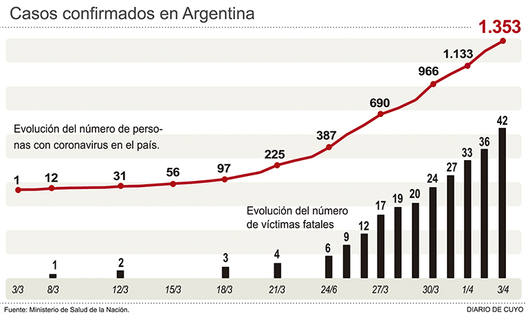 Cinco personas murieron y otras 88 fueron diagnosticadas en las últimas 24 horas con coronavirus en la Argentina, con lo que suman 42 las víctimas fatales y 1.353 los infectados desde el inicio de la pandemia, informó ayer el Ministerio de Salud de la Nación. Del total de los casos confirmados hasta hoy, 656 son importados, 444 contactos estrechos de casos confirmados, 113 son casos de circulación comunitaria y el resto se encuentra bajo investigación epidemiológica.