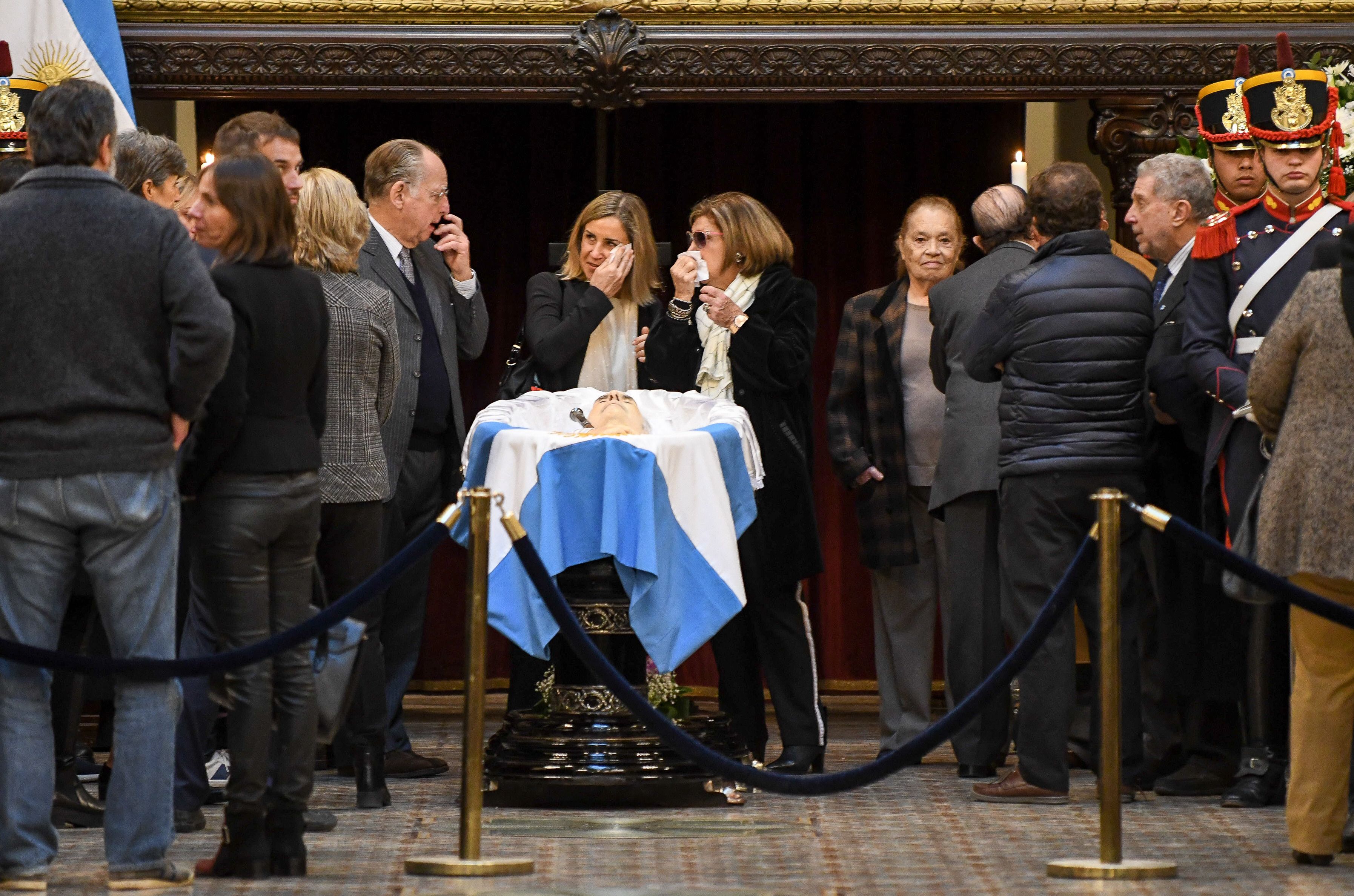 Velatorio. El féretro de De la Rúa fue ubicado en el extremo sur del Salón de Pasos Perdidos, y los restos engalanados con su bastón presidencial y una bandera. Lo acompañaron su esposa, Inés Pertiné, -derecha- y sus tres hijos.